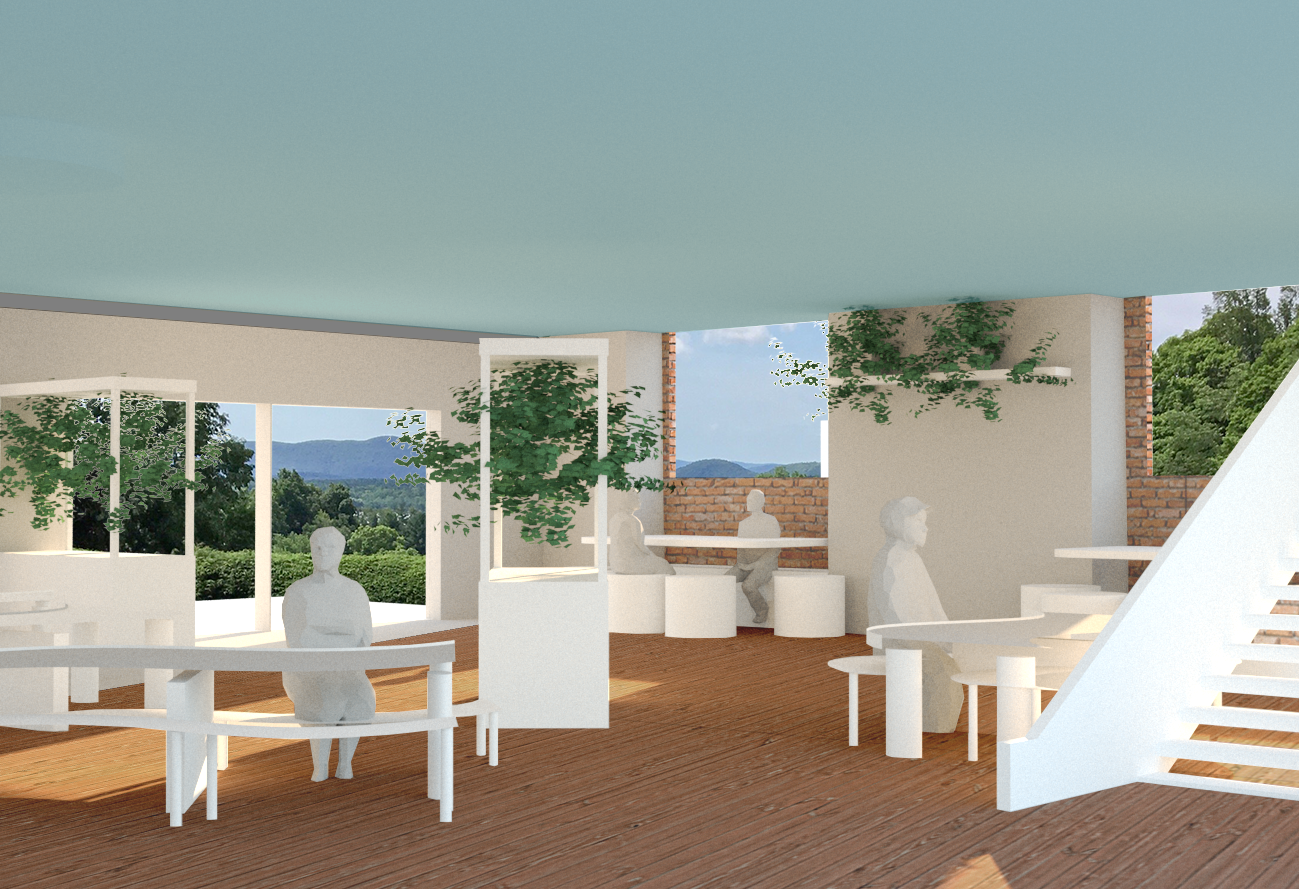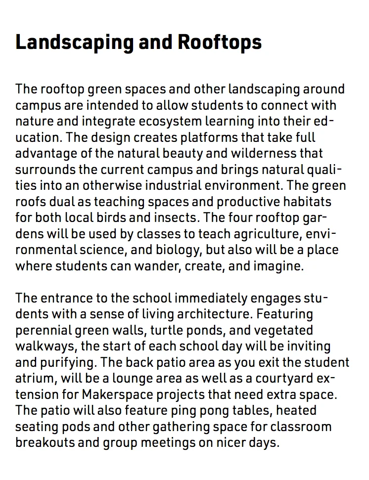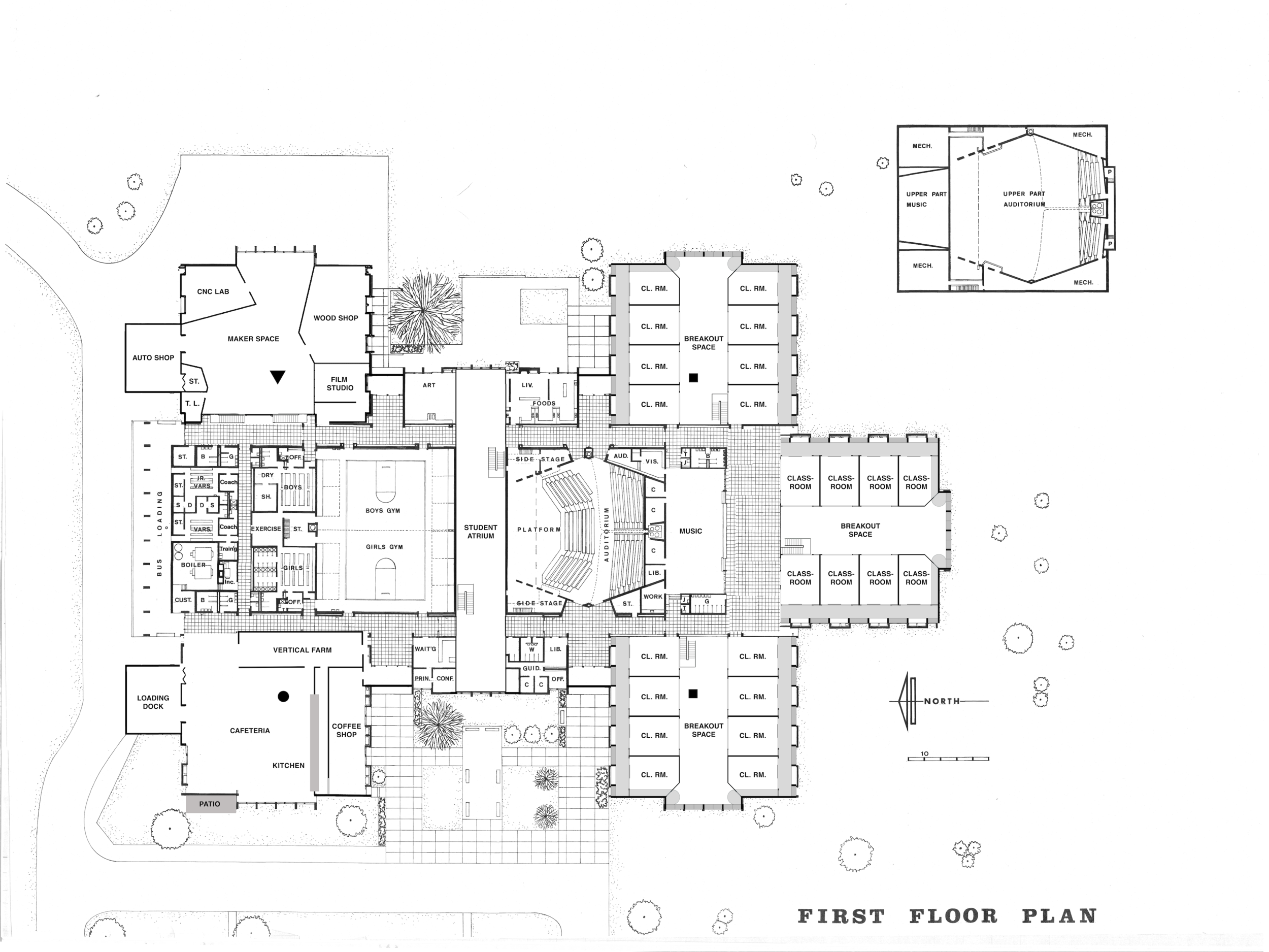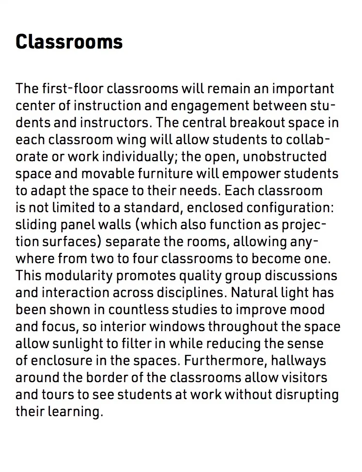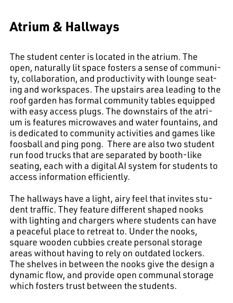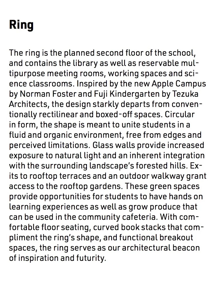 Our architectural advisor Mitch observed early in our design process that the school we chose to redesign bears a striking resemblance to a turtle. We embraced this imagery, and added an open carapace, or shell, to it’s back--the Ring. The new first-floor plan places an emphasis on open layouts with lofted spaces to help lift and expand students’ imagination. This is captured both by the expansive Student Atrium which replaced the former music rooms in the middle of the school, and by the redesigned limbs that each have large central gathering spaces. To create the central passageway for the Atrium the music rooms were moved to the former library space behind the head of the school, and the library was elevated to the second floor. Each leg of the turtle houses a unique identifying pillar (bolded in black) to support the Ring.