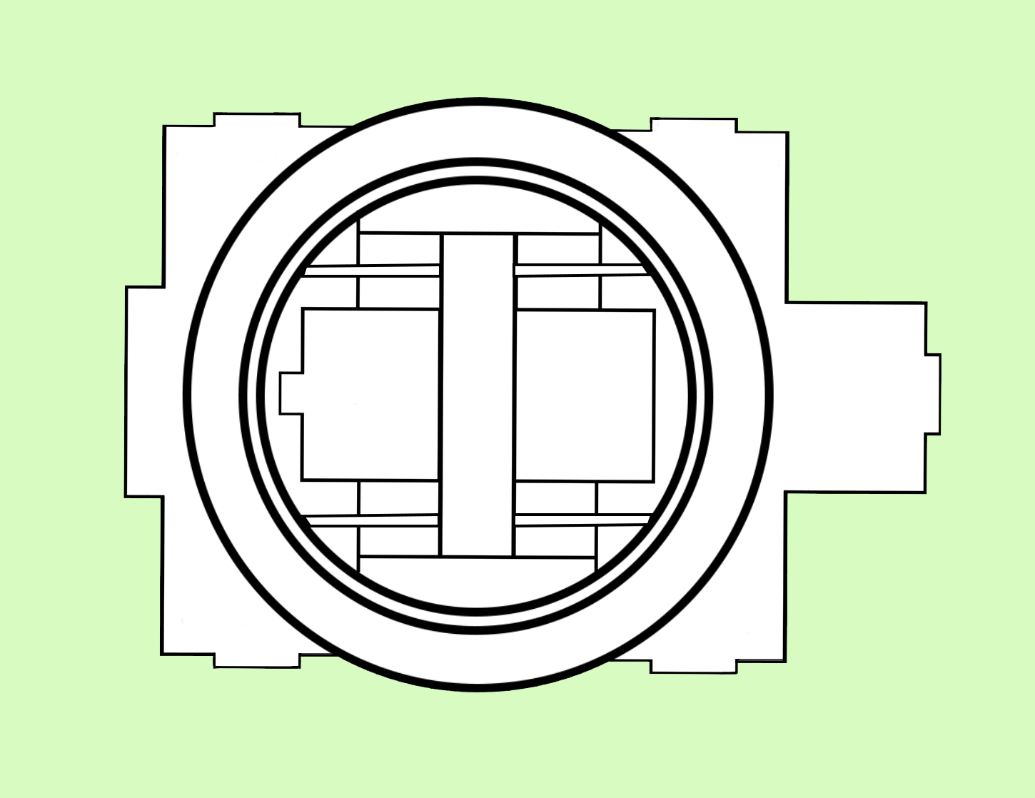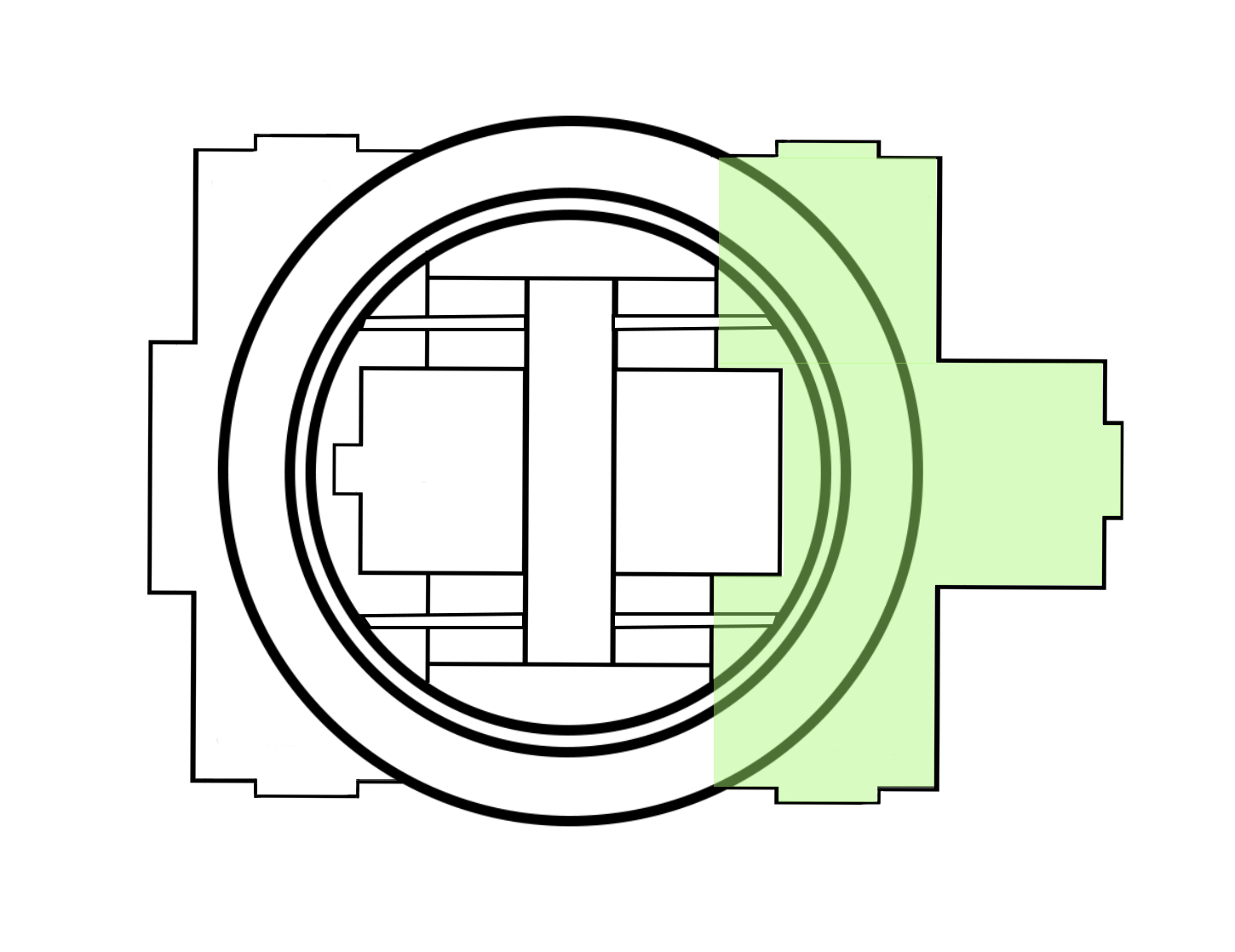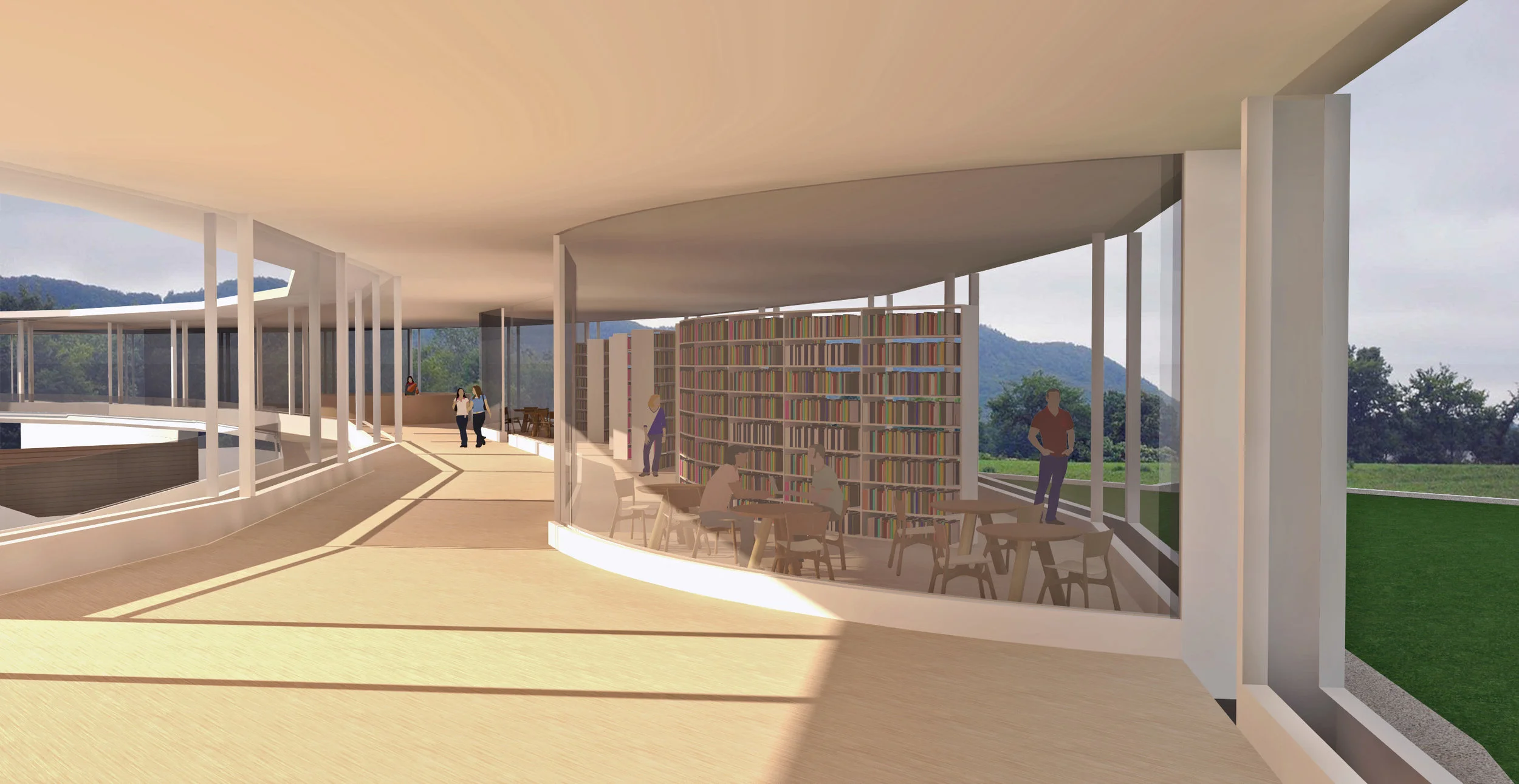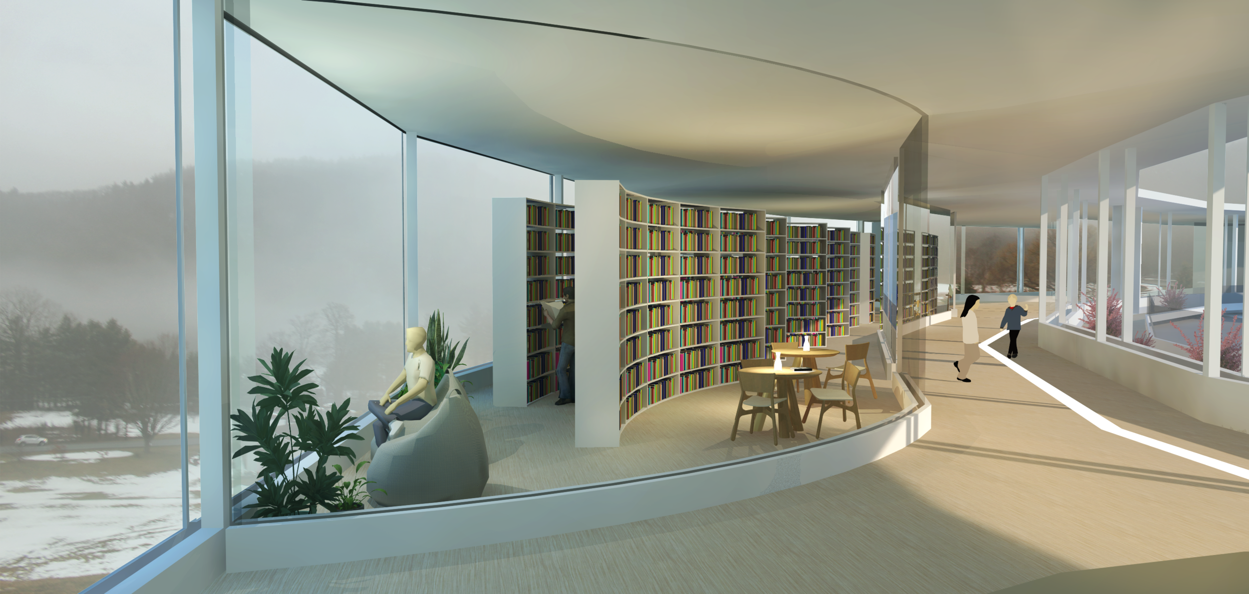 Our architectural advisor Mitch observed early in our design process that the school we chose to redesign bears a striking resemblance to a turtle. We embraced this imagery, and added an open carapace, or shell, to it’s back--the Ring. The new first-floor plan places an emphasis on open layouts with lofted spaces to help lift and expand students’ imagination. This is captured both by the expansive Student Atrium which replaced the former music rooms in the middle of the school, and by the redesigned limbs that each have large central gathering spaces. To create the central passageway for the Atrium the music rooms were moved to the former library space behind the head of the school, and the library was elevated to the second floor. Each leg of the turtle houses a unique identifying pillar (bolded in black) to support the Ring.