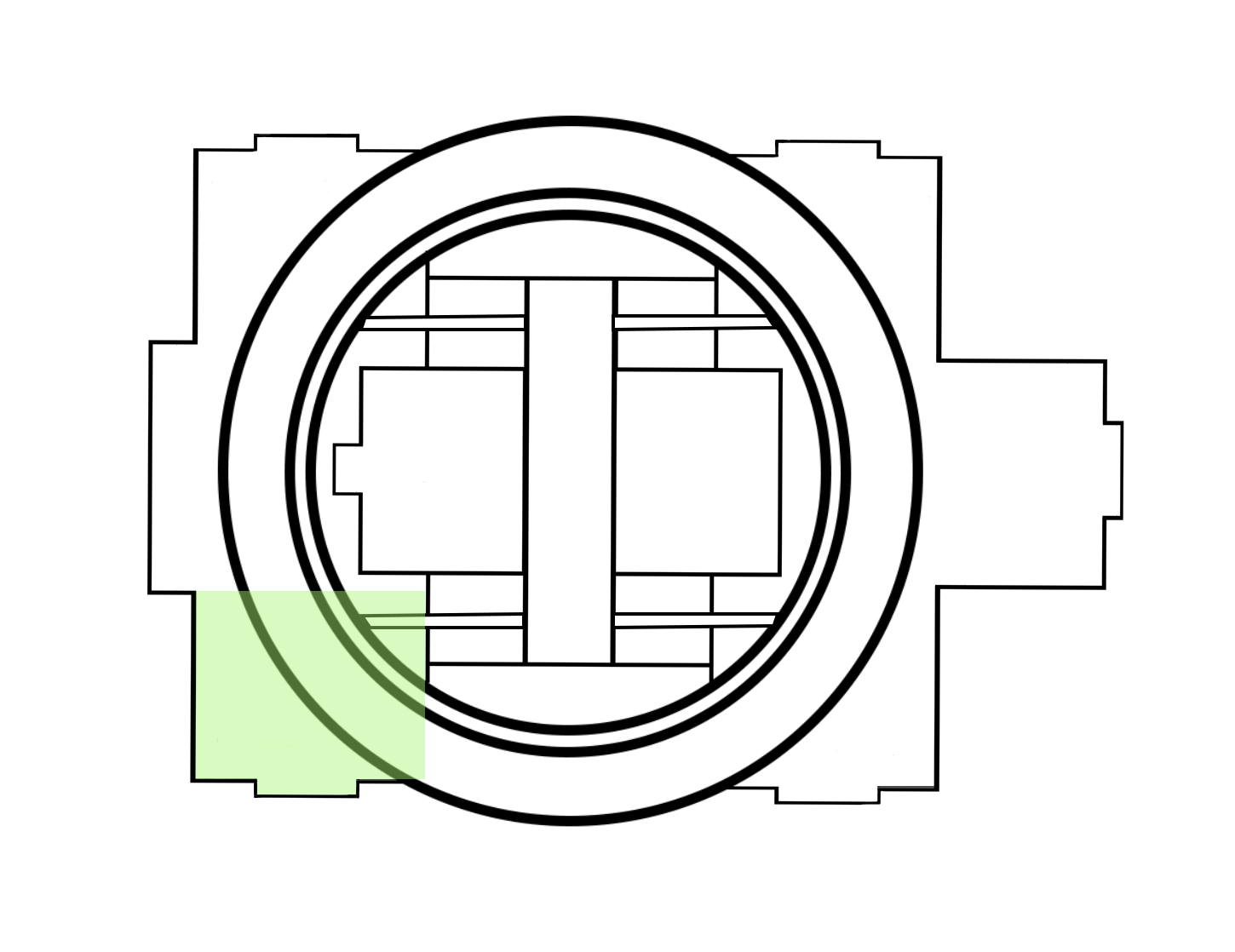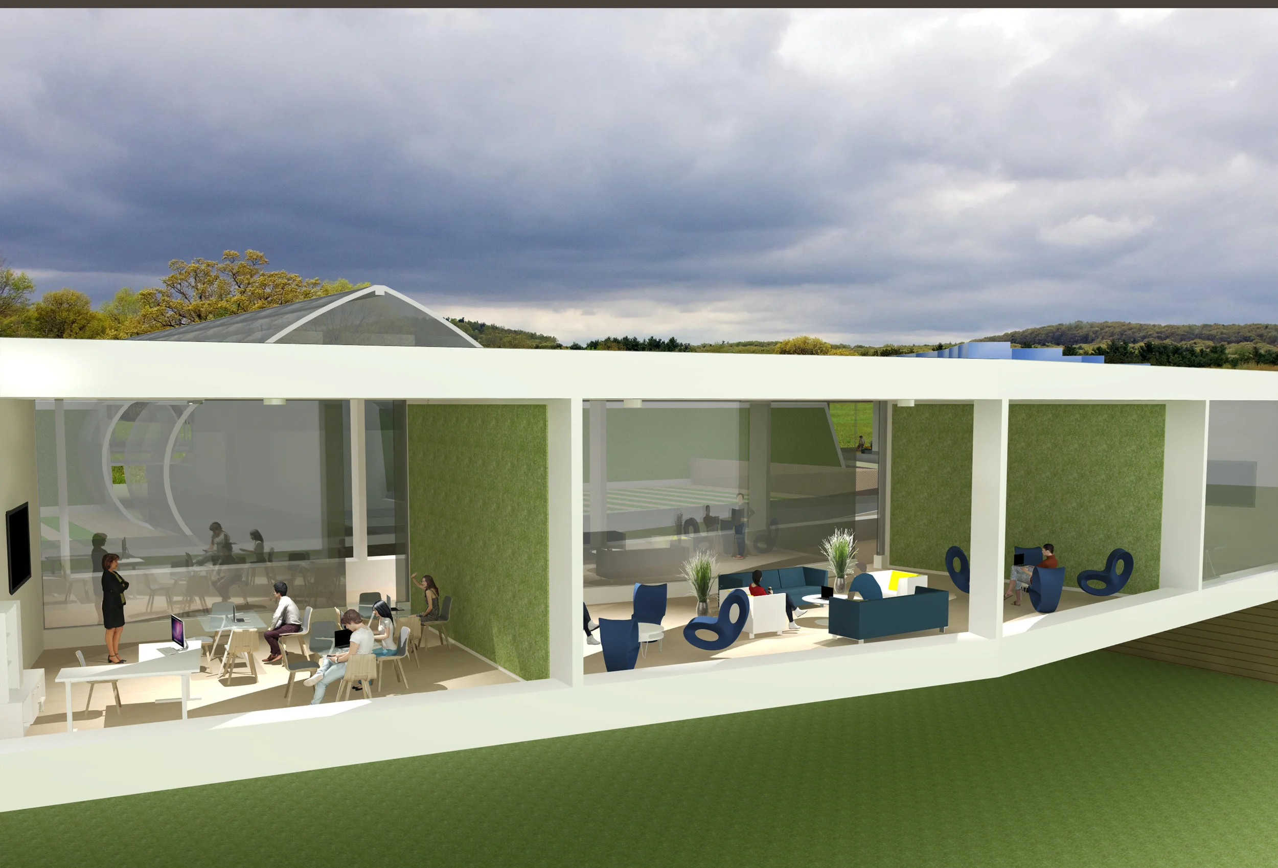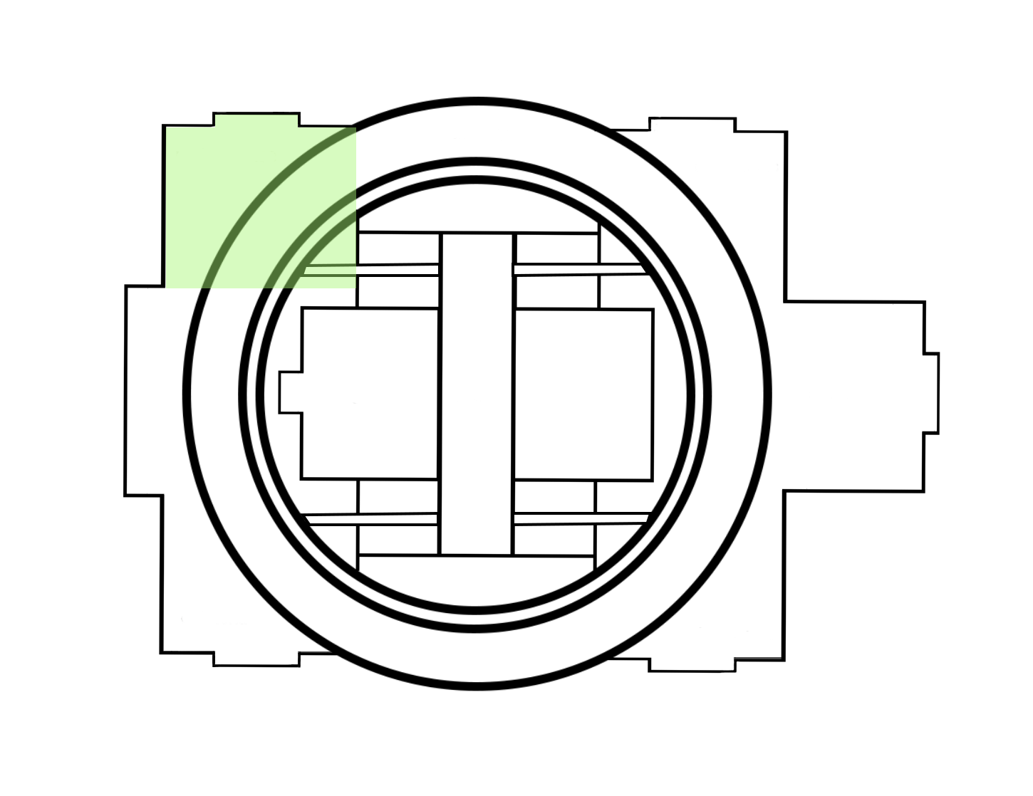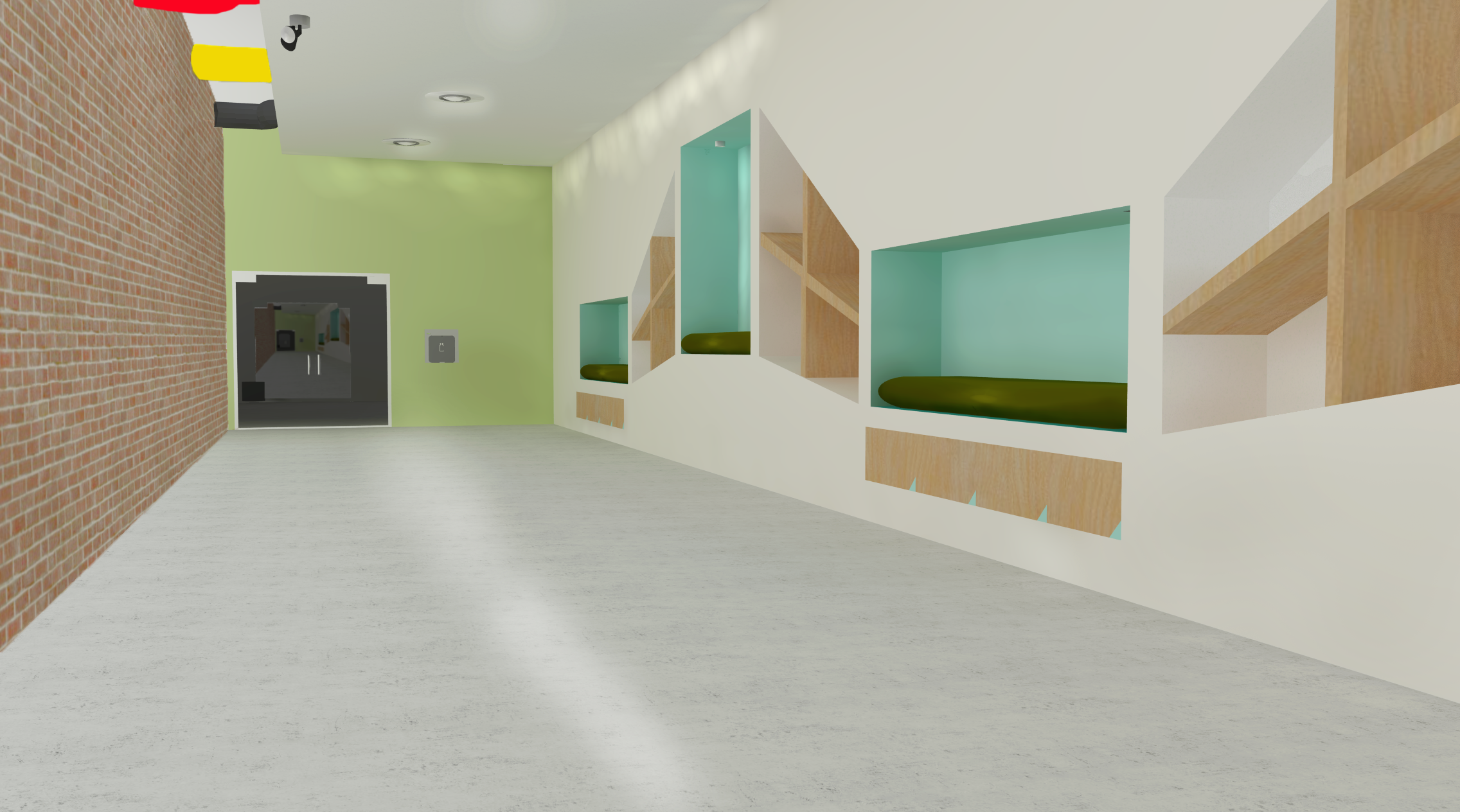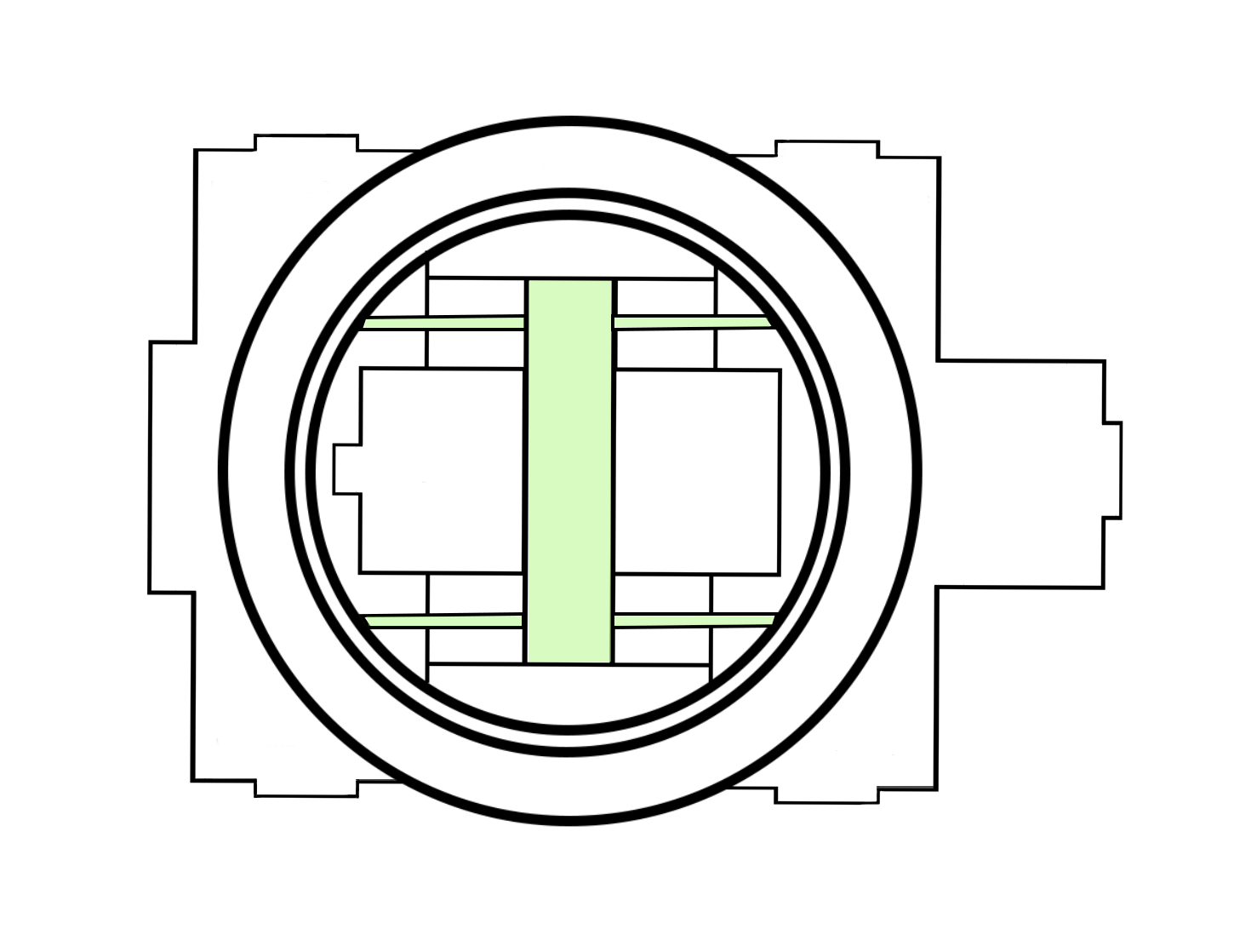 Our architectural advisor Mitch observed early in our design process that the school we chose to redesign bears a striking resemblance to a turtle. We embraced this imagery, and added an open carapace, or shell, to it’s back--the Ring. The new first-floor plan places an emphasis on open layouts with lofted spaces to help lift and expand students’ imagination. This is captured both by the expansive Student Atrium which replaced the former music rooms in the middle of the school, and by the redesigned limbs that each have large central gathering spaces. To create the central passageway for the Atrium the music rooms were moved to the former library space behind the head of the school, and the library was elevated to the second floor. Each leg of the turtle houses a unique identifying pillar (bolded in black) to support the Ring.